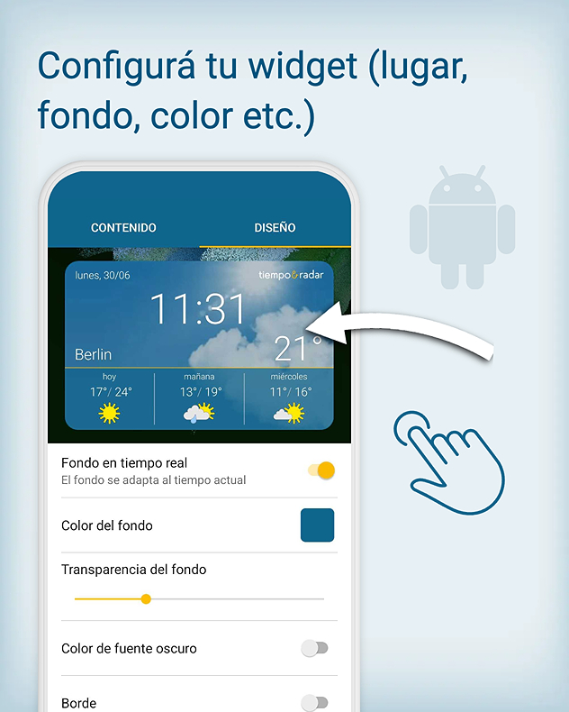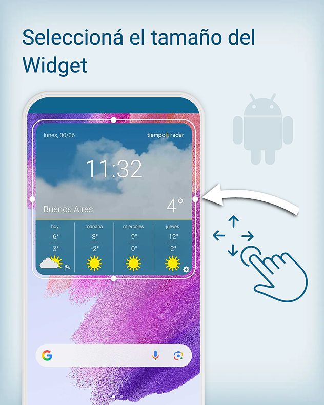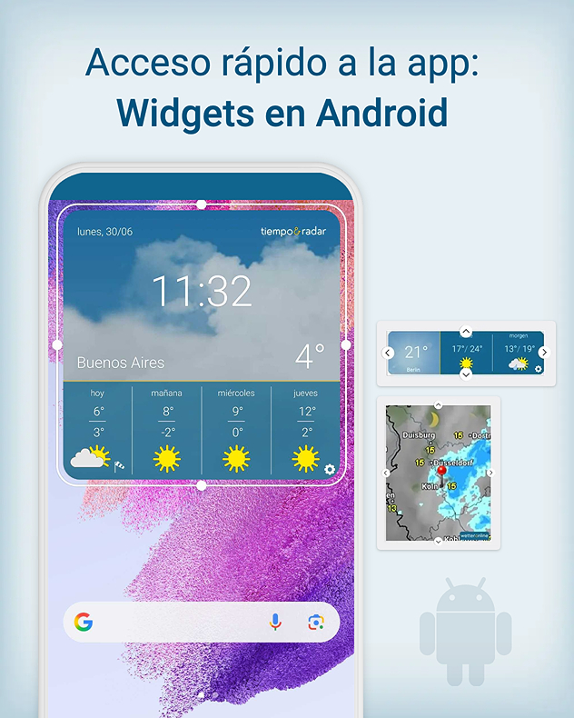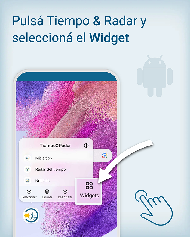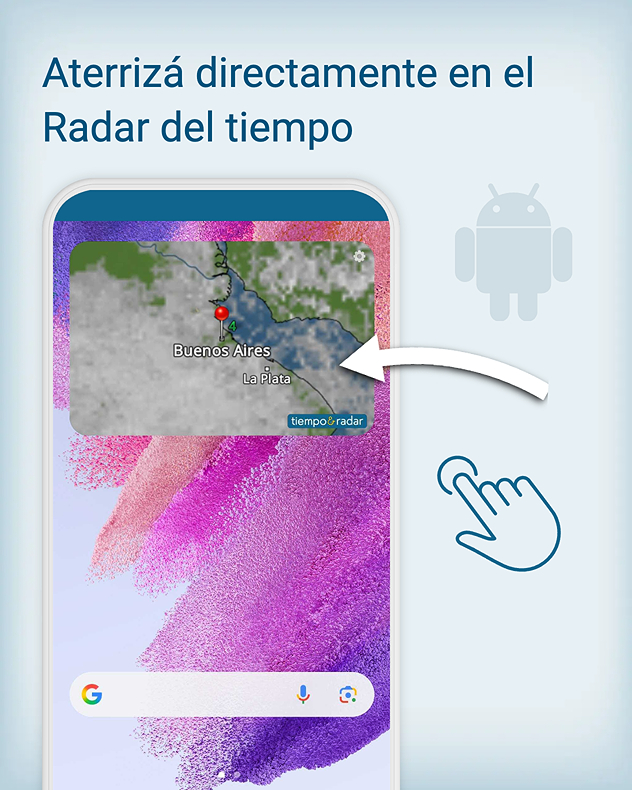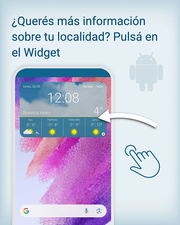 Hacelo más útil a tu celular: agregá el widget de Tiempo & Radar a la pantalla de inicio. Te muestra el tiempo de un vistazo y, con solo tocarlo, podés acceder rápido al pronóstico completo de tu localidad o directamente al radar del tiempo.