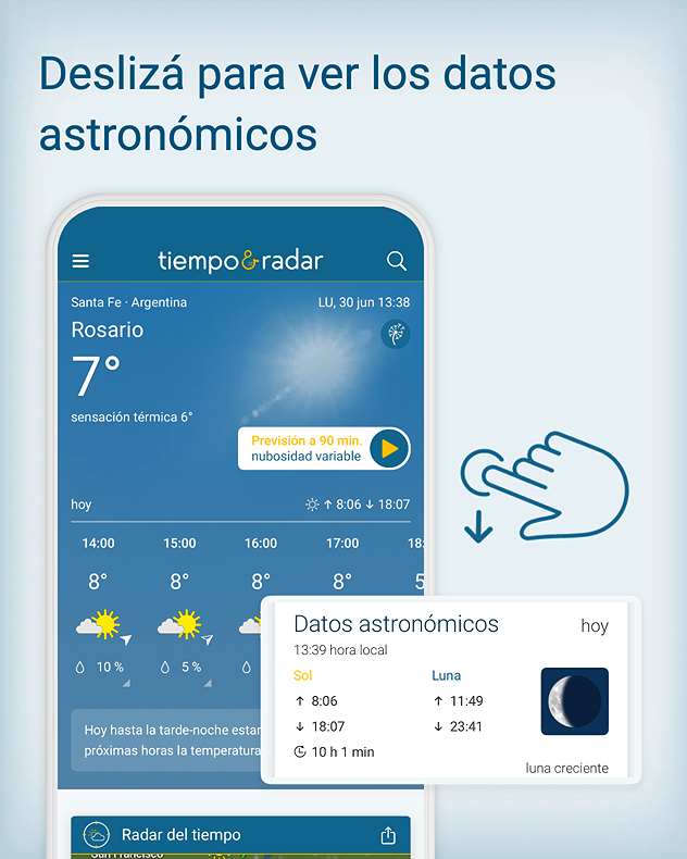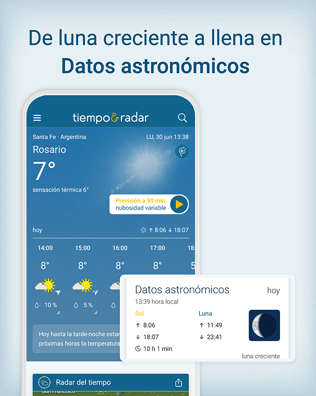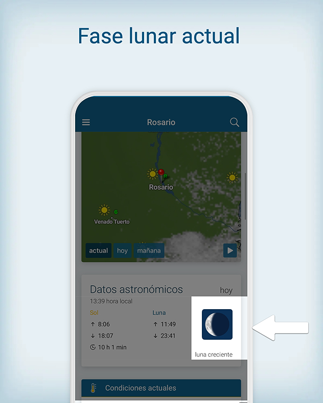 También podés encontrar info sobre la fase actual de la luna y los horarios de salida y puesta del sol.