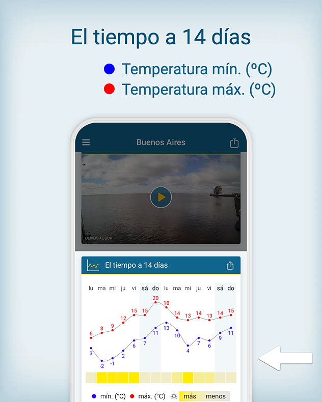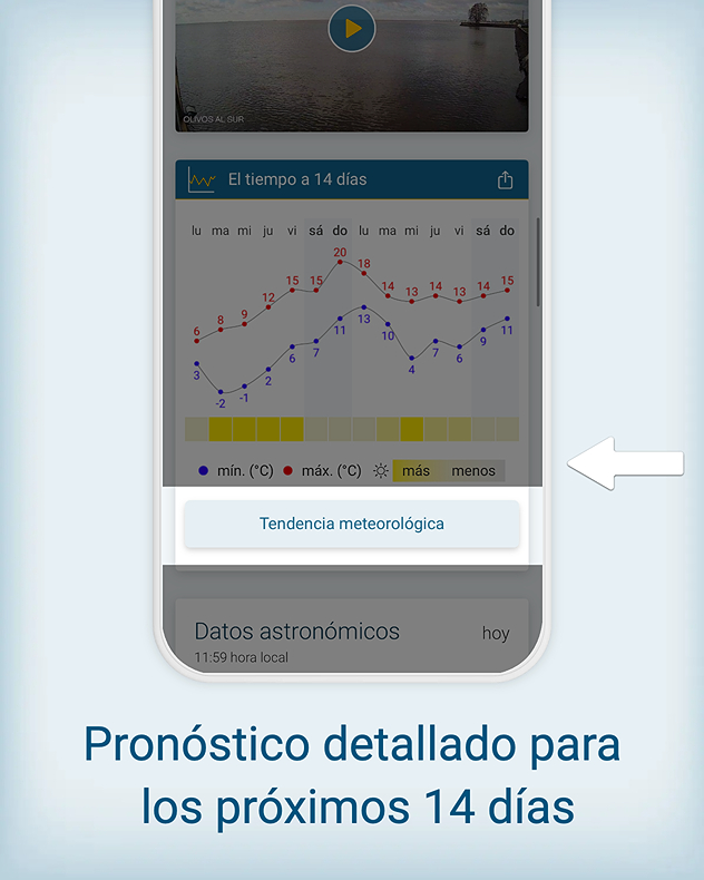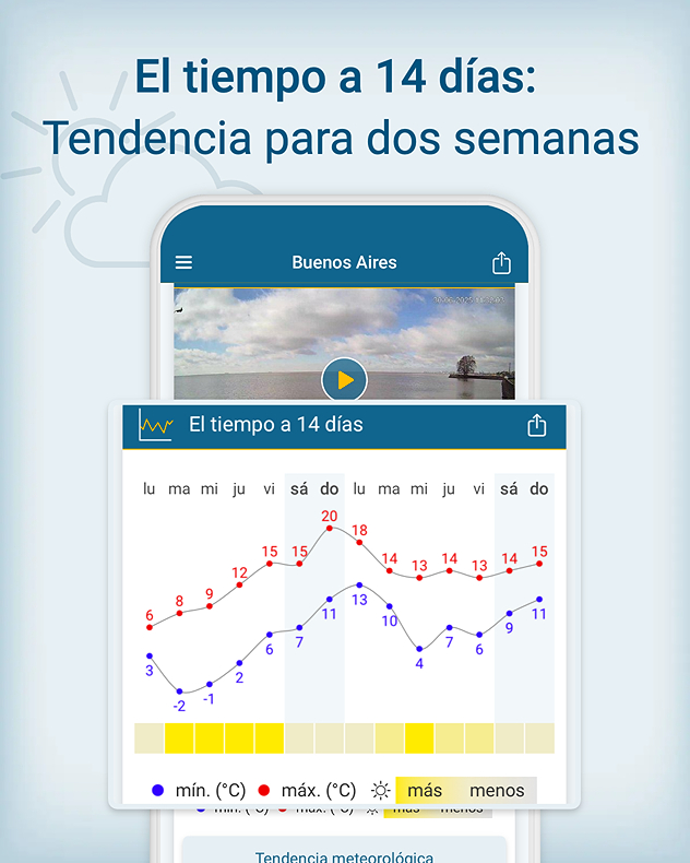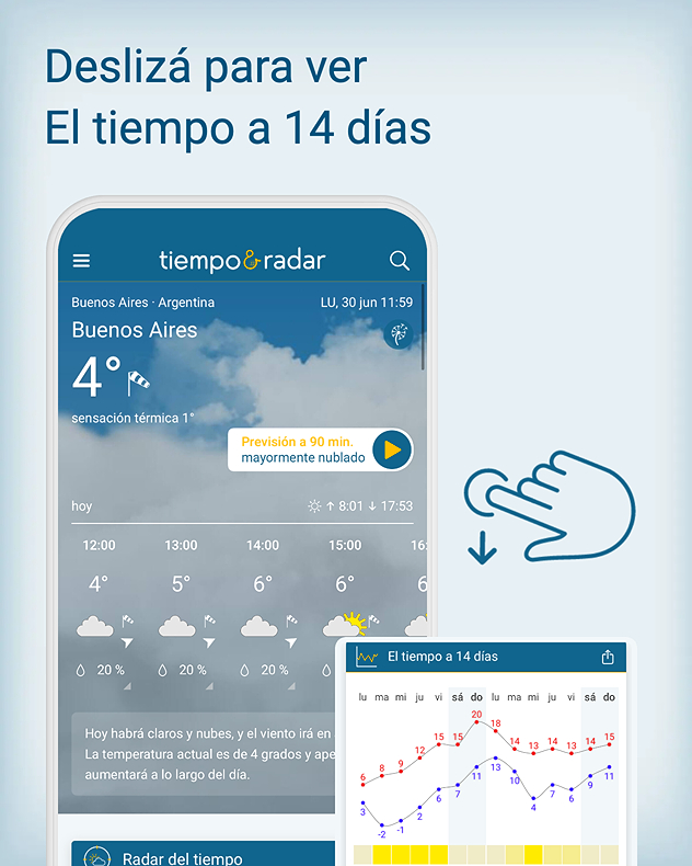 Con la previsión a 14 días de Tiempo & Radar vas a estar siempre un paso adelante del sol, el viento y la lluvia.