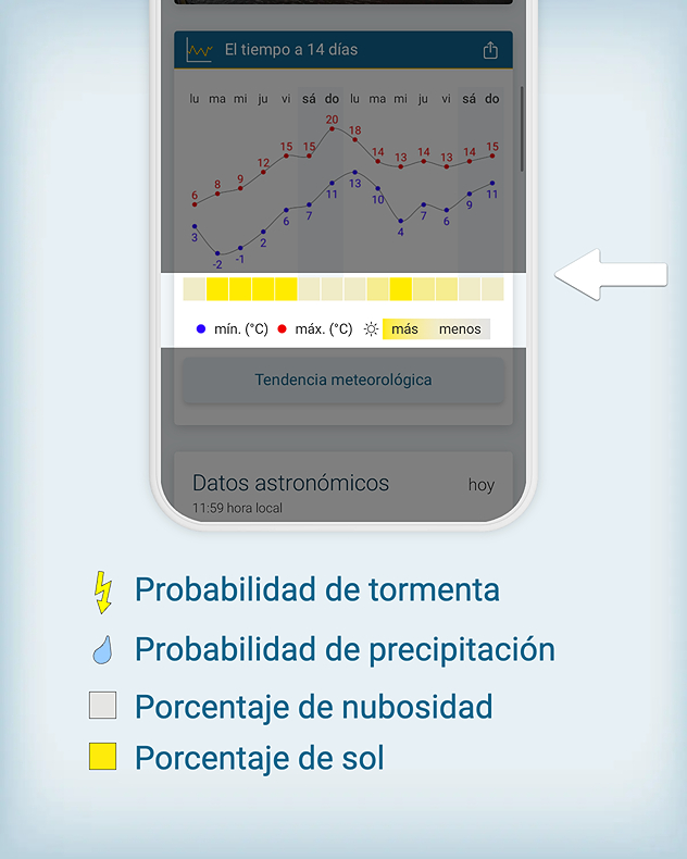 Un gráfico simple te muestra de un vistazo cómo va a evolucionar la temperatura en tu zona y si se vienen días soleados o con lluvia.
