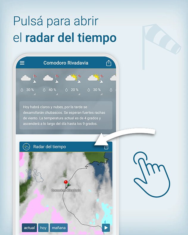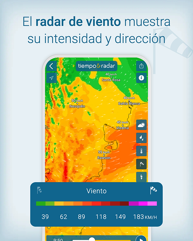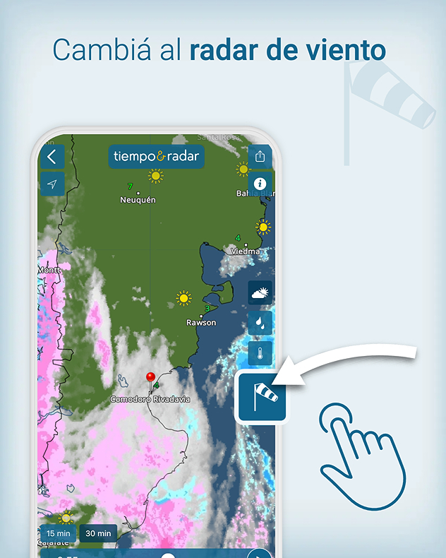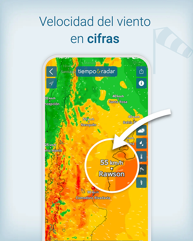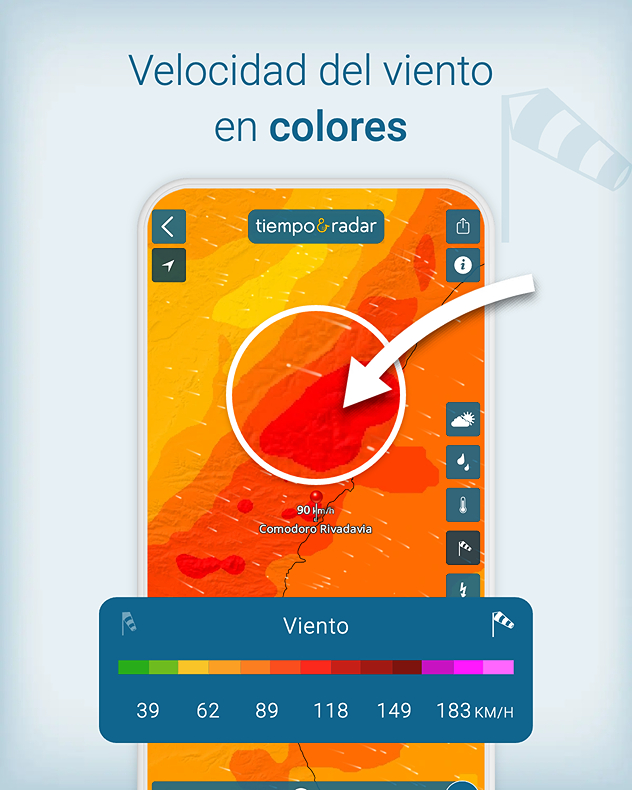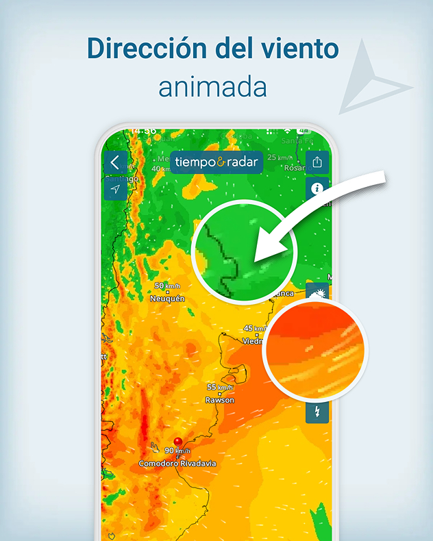 Para acceder a este radar, pulsa sobre el radar del tiempo para abrirlo en pantalla completa. Luego, selecciona el icono de la manga de viento para cambiar a este radar, el cual muestra dos informaciones clave: la dirección y velocidad de las ráfagas viento. A simple vista, observarás la animación de unas líneas que indican la dirección del flujo, mientras que los colores muestran la intensidad.